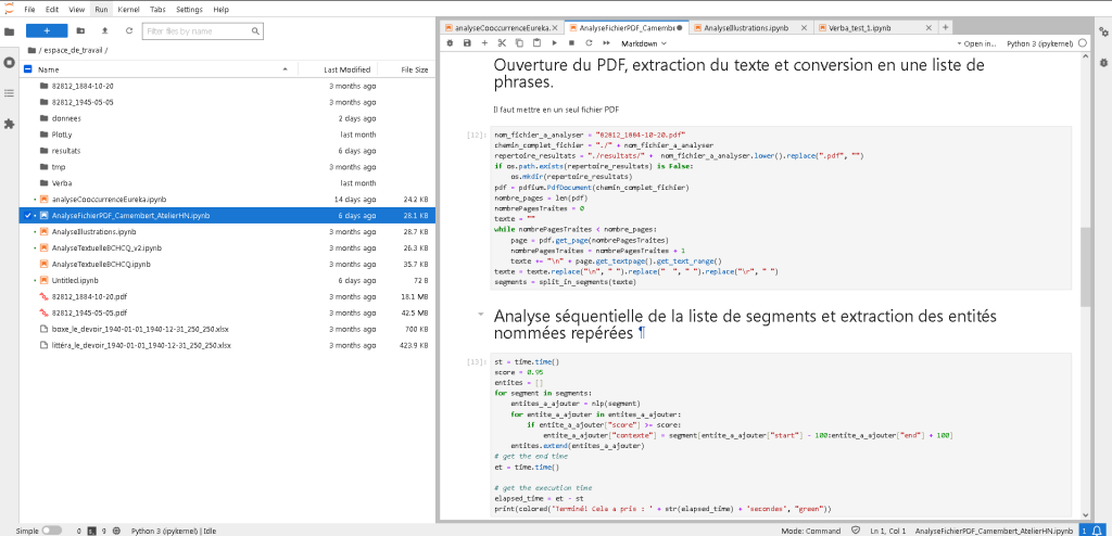 Le Centre met à disposition un environnement computationnel et des ressources informatiques via sa plateforme JupyterHub. La plateforme donne accès à des jeux de données et des corpus exclusifs (Voir la section « Jeux de données et corpus »). Elle contient également une banque de scripts qui facilitent la recherche, l’extraction et le traitement des données ainsi qu’un espace personnel pour chaque usager et usagère destiné au stockage et à l’expérimentation. Les usagers et usagères peuvent par exemple effectuer de la fouille de texte, de l’extraction d’entités nommées et de la géolocalisation de lieux.
