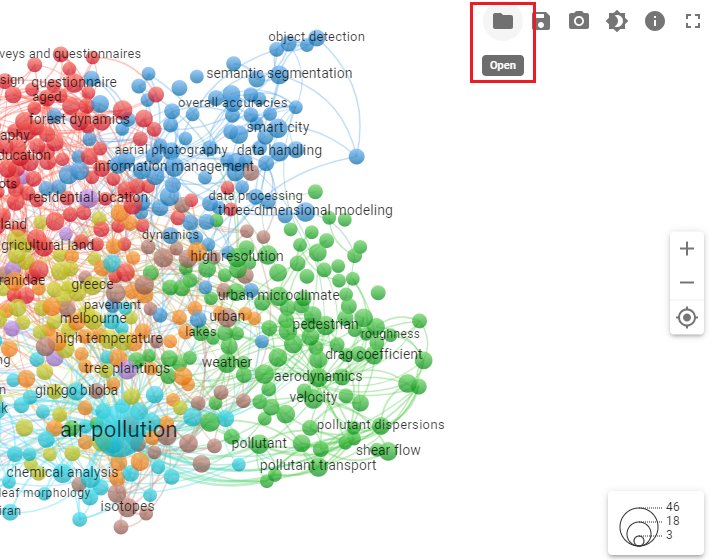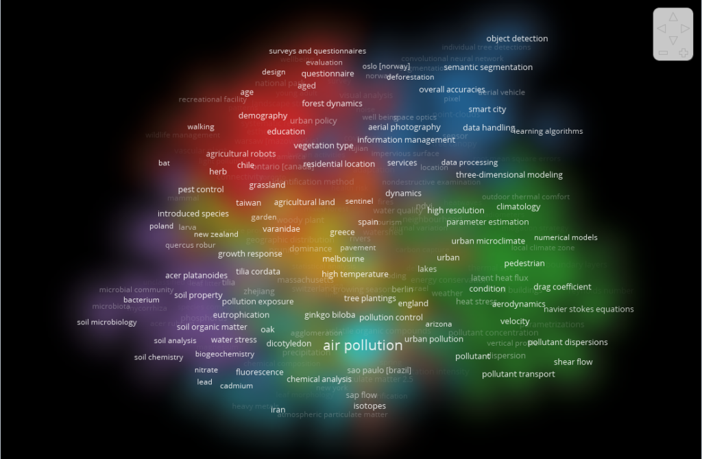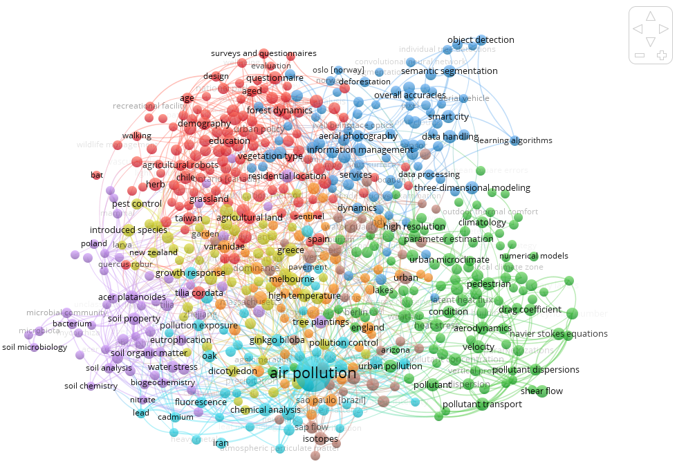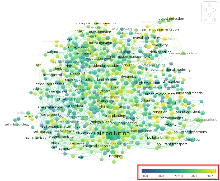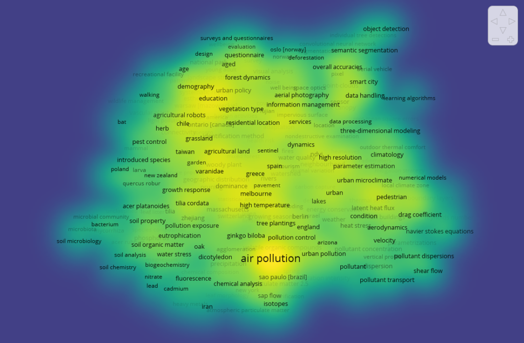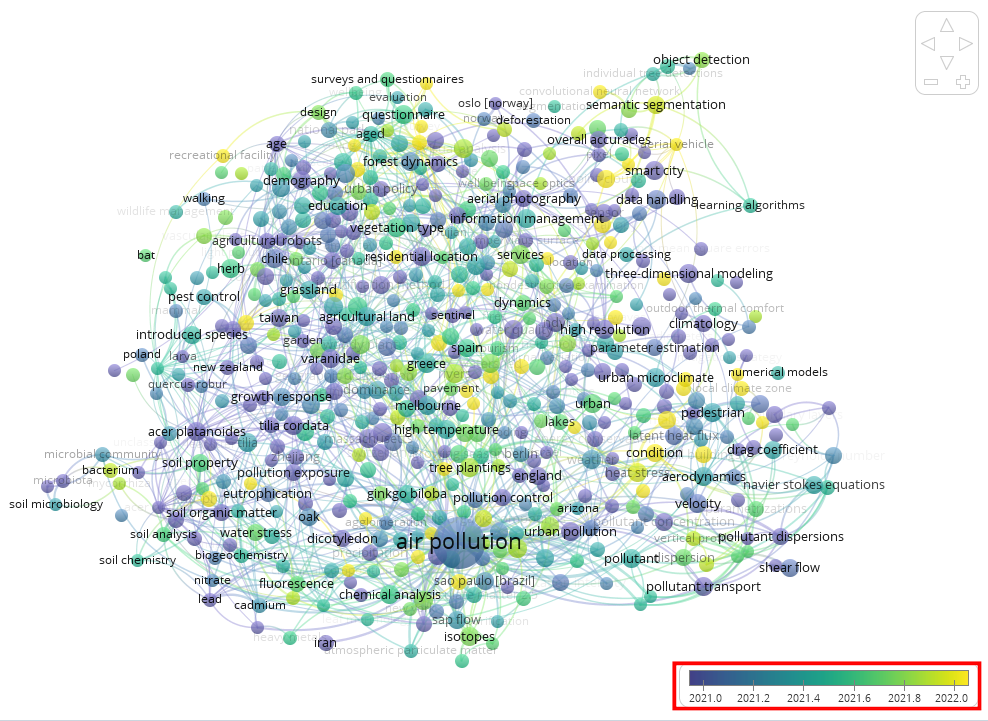 Pour notre scénario, nous avons généré un graphe d’analyse temporelle montrant que le mot-clé « air pollution » était surtout fréquent en 2021. Ce fait suggère qu’il était un thème transversal des recherches abordant la foresterie urbaine auparavant, mais que son importance diminuera dans les années à venir.