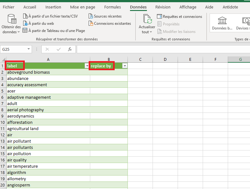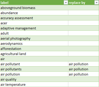 Pour tous les termes dans la colonne « label » qui parlent du même sujet , attribuez leur un même mot-clé dans la colonne « replace by » (Figure 12). Vous allez ainsi pouvoir regrouper tous les mots-clés similaires sous un seul terme générique, ce qui vous aidera à identifier les relations d’un sujet donné avec d’autres termes.
