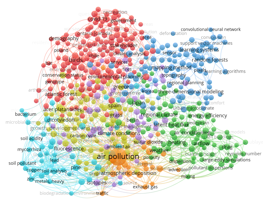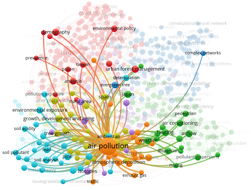 Pour ce scénario, nous avons généré un graphe avec 7 regroupements par couleur. On y voit que le mot-clé le plus fréquent est « air pollution ». Celui-ci entretient par ailleurs des liens avec plusieurs termes en dehors du regroupement auquel il appartient. Conséquemment, on peut supposer qu’il s’agit d’un thème transversal des recherches qui abordent la foresterie urbaine.