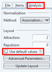 Vous pouvez modifier la disposition des regroupements par couleur pour faciliter leur analyse. Dans la colonne à gauche de l’écran, cliquez sur « Analysis ». Puis, sous l’onglet « Layout » décochez « Use default values » (Figure 16). Vous pouvez maintenant ajuster les valeurs d’attraction et de répulsion entre les points de votre graphe. Une fois les nouvelles valeurs saisies, appuyez sur le bouton « Update layout » pour appliquer les changements et générer une nouvelle visualisation.
