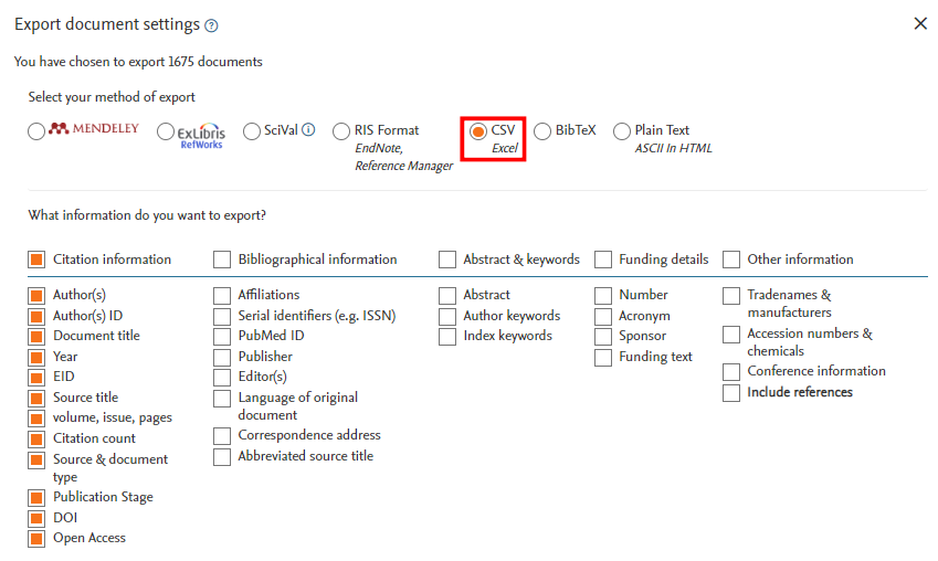 Dans la fenêtre contextuelle qui apparaît, cochez les informations pertinentes pour votre analyse. Enfin, cliquez sur « CSV » et « Export » (Figure 3). Dans le cas où vous voulez exporter plus de 2000 notices, répétez ces étapes par tranche de 2000 résultats.