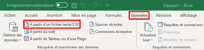 Ouvrez Microsoft Excel (ou Libre Office CALC). Cliquez sur l’onglet « Données » en haut de l’écran, puis sur « À partir d’un fichier texte/CSV » (Figure 10). Charger la liste de mots-clés que vous avez téléchargée.