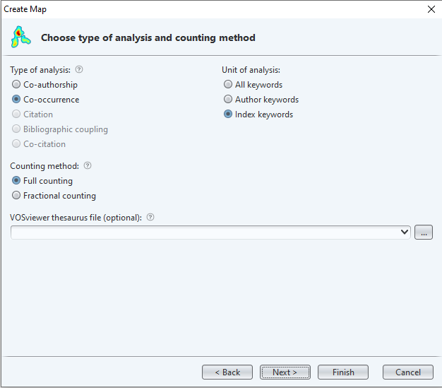Retournez dans VOSViewer. Dans la fenêtre contextuelle où se trouve la liste de mots-clés, cliquez sur le bouton « Back » 3 fois, jusqu’à revenir au menu des paramètres d’analyse (Figure 13). Dans le menu des paramètres d’analyse, cliquez sur le bouton « … » et charger votre thésaurus. Cliquez sur « Next ».
