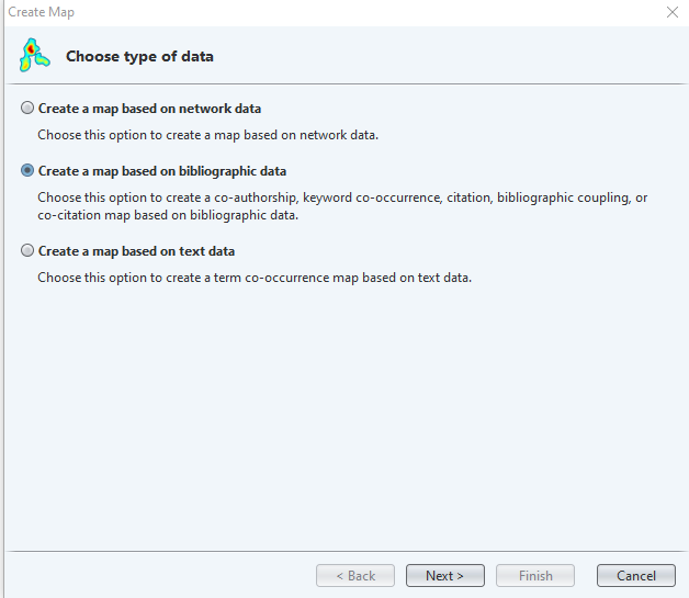 Ouvrez VOSViewer. Déplacez votre curseur dans la colonne à gauche de l’écran et cliquez sur « Create ». Dans la fenêtre contextuelle qui apparaît, choisissez « Create a map based on bibliographic data » pour analyser des donnés bibliographiques (Figure 4). À titre informatif, sachez que l’option « Create a map based on text data » permet d’analyser les titres et les résumés d’articles, et que l’option « Create a map based on network data » permet d’analyser des données qui ont été traitées pour l’analyse de réseau au préalables.