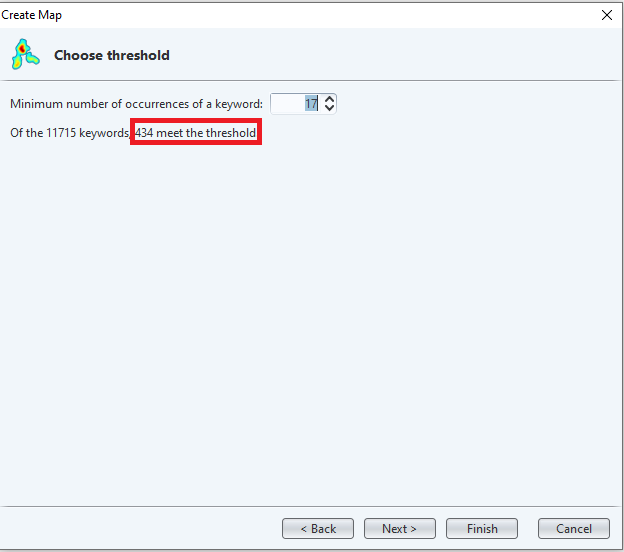 Rétablissez une fréquence minimale des termes à retenir pour votre analyse. Encore une fois, privilégiez une valeur entre 350 et 500. Quand vous aurez fini, appuyez sur « Finish » pour générer un graphe.