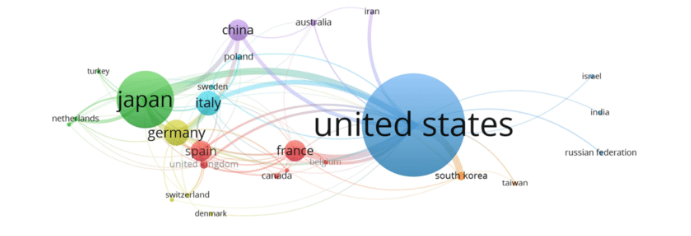 - Co-autorat (co-authorship) : permet d’analyser les collaborations entre des auteurs ou autrices, entre des organisations ou entre des pays.