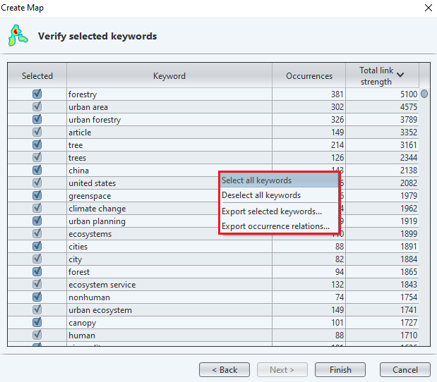 VOSViewer vous présente maintenant une liste de mots-clés. Faites un clic droit sur la liste et cliquez sur « Export selected keywords » dans le menu contextuel qui apparaît (Figure 9). Sauvegardez le document sur votre ordinateur, en format TXT.
