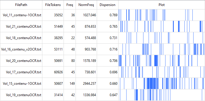 Chaque ligne du tableau désigne un fichier dans lequel votre mot-clé apparaît. La colonne « FileTokens » indique le nombre total de mots à l’intérieur du fichier, tandis que la colonne « Freq » donne le nombre d’occurrences du mot-clé à l’intérieur du fichier. La dernière colonne du tableau indique avec des barres de couleur bleue les passages du fichier où votre mot-clé est utilisé.