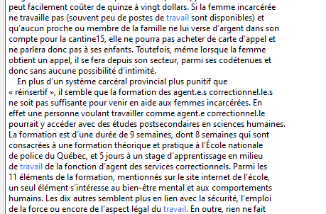 Pour ce scénario, nous avons analysé le mot-clé « travail » avec KWIC. Ce mot apparaît 467 fois dans les numéros de FéminÉtudes choisis. On le retrouve souvent dans les expressions « organisation du travail » et « travail du sexe », ce qui indique que ces deux sujets sont importants pour les membres de l’IREF. En consultant certains passages avec « File View », on constate que le mot-clé n’as pas toujours un lien direct avec le sujet d’un article : par exemple, lorsqu’on analyse la formation au travail d’agent ou d’agente de services correctionnels pour émettre un constat sur le bien-être des femmes incarcérées.