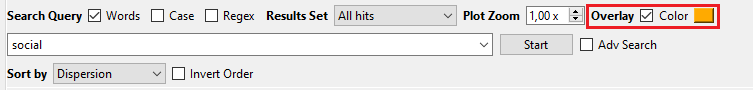 Vous pouvez comparez la distribution des occurrences pour deux mots-clés en même temps. Retournez dans l’outil Plot, puis déplacez votre curseur en bas de la fenêtre. Tapez un premier mot-clé et appuyez sur « Start ». Puis, cochez l’option « Overlay » et cliquez sur le carré de couleur bleue pour lui assigner une nouvelle teinte. Entrez un nouveau mot-clé dans la barre de recherche et cliquez sur « Start ».