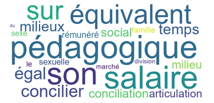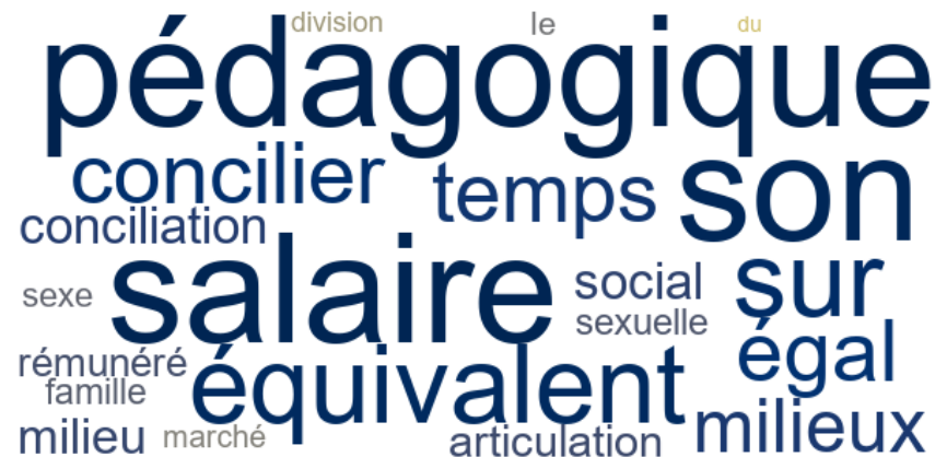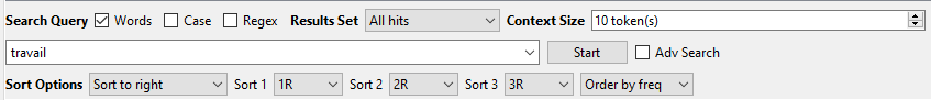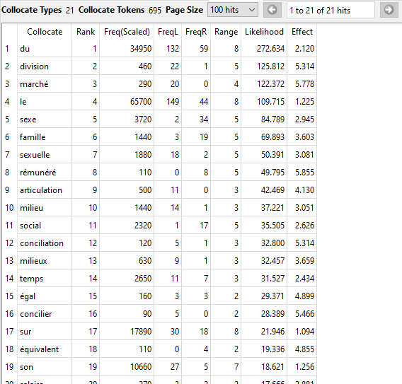 Pour ce scénario, nous avons utilisé Collocate pour dresser la liste des mots les plus susceptibles d’être utilisés avec le mot-clé « travail ». Les mots « division », « marché », « sexe » et « famille » figuraient parmi les premiers résultats. Nous en avons déduit que la division (sexuelle) du travail, les défis que rencontrent les femmes sur le marché du travail, le travail du sexe et la conciliation travail-famille chez les femmes sont autant d’enjeux importants pour les membres de l’IREF qui contribuent à FéminÉtudes.
