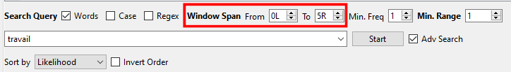 Vous pouvez restreindre la portée de la recherche en excluant les mots qui apparaissent à une distance x de votre mot-clé, soit avant (L) ou après (R) celui-ci. Pour ce faire, déplacez votre curseur en bas de la fenêtre, puis ajuster les valeurs de « L » et « R ». Si votre tableau contient beaucoup de déterminants (le, du, une, etc.) nous vous recommandons d’exclure les mots qui sont utilisés avant votre mot-clé en définissant la valeur de « L » à 0.