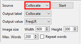 AntConc vous permet de créer un nuage de mots à partir des résultats de vos analyses. Pour ce faire, sélectionnez Wordcloud dans la barre d’outils. Déplacez votre curseur en bas à gauche de l’interface et cliquez sur le bouton à droite de « Source » afin de préciser l’analyse dont vous souhaitez représenter les résultats par une image. Une fois votre choix fait, cliquez sur « Start » pour générer un nuage de mots.