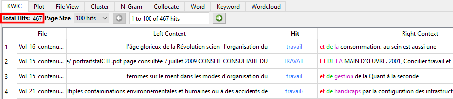 Vous verrez alors apparaître un tableau. Chaque ligne du tableau correspond à une occurrence de votre mot-clé à l’intérieur du corpus. Plus le mot-clé apparaît souvent dans votre corpus, plus le tableau comporte de lignes. Le nombre total d’occurrences du mot-clé est affiché en haut à gauche de la fenêtre.