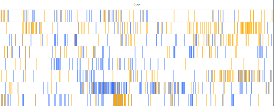 Dans le tableau nouvellement généré, la dernière colonne devrait présenter des barres de deux couleurs. Utiliser les paramètres d’agrandissement (Plot Zoom) pour mieux les observer. Est-ce qu’elles sont souvent rapprochées? Dans quels passages, quels fichiers? Faites un double-clic sur les passages qui vous semblent les plus intéressants pour les lire avec l’outil File View.