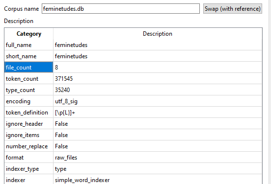 Cliquez sur le bouton « Create » en bas à gauche du Corpus Manager. Vous devriez alors voir apparaître, à droite de la fenêtre, un tableau avec des informations concernant le corpus nouvellement créé. Vérifiez si le nombre de fichiers TXT chargés dans AntConc est le bon à partir de la ligne « file_count ». Enfin, cliquez sur le bouton « Return to Main Windows » pour commencer l’analyse.