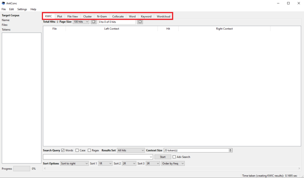 En haut de l’interface principale de AntConc se trouve une barre d’outils pour l’analyse de cooccurrences. Le premier des outils que nous allons utiliser est KWIC, pour « Key-word-in-context ». KWIC vous permet de voir les mots qui entourent chaque occurrence d’un mot-clé dans votre corpus. Il est ouvert par défaut lorsque vous commencez une analyse.