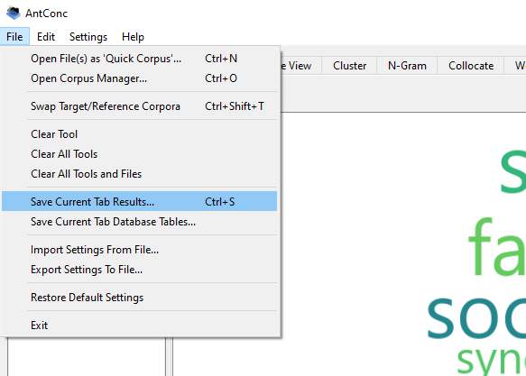 Une fois que vous avez obtenu un nuage de mots qui vous satisfait, déplacez votre curseur en haut à gauche de la fenêtre. Cliquez sur « File », puis sur « Save current tab results ». Votre explorateur de fichiers s’ouvrira alors. Nommer votre nuage de mots et sauvegardez-le sur votre ordinateur.