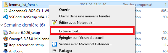 Téléchargez le fichier suivant. Dans votre explorateur de fichiers, faites un clic droit sur le fichier nouvellement téléchargé et sélectionnez « Extraire tout ». Vous aurez maintenant accès à un fichier en format TXT nommé « lefff-antconclex-f ». Il s’agit d’une liste de lemmes qu’AntConc utilisera pour lemmatiser automatiquement les mots dans votre corpus.