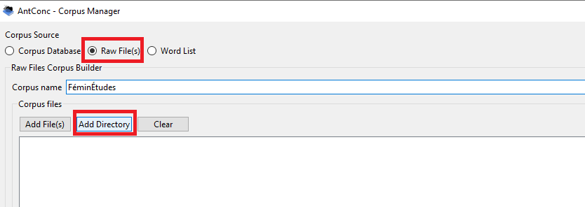 Dans la fenêtre contextuelle qui apparaît, cliquez sur « Raw File(s) », puis « Add Directory ». Votre explorateur de fichier s’ouvrira alors. Sélectionnez et chargez votre dossier, puis donnez un nom à votre corpus dans le Corpus Manager.
