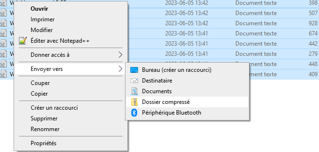 La dernière chose à faire avant d’ouvrir AntConc est de déplacer tous vos fichiers dans un même dossier. Ouvrez votre explorateur de fichiers. Sélectionnez tous vos textes avec CTRL+A, puis faites un clic droit. Dans le menu contextuel qui apparaît, sélectionnez « Envoyer vers », puis « Dossier compressé ».