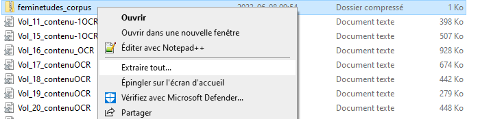 Donnez au dossier compressé nouvellement créé un nom qui facilitera son repérage. Puis, faites un clic droit sur le dossier compressé. Dans le menu contextuel qui apparaît, sélectionnez « Extraire tout ». Vous disposez maintenant d’un dossier que vous pourrez importer dans AntConc.