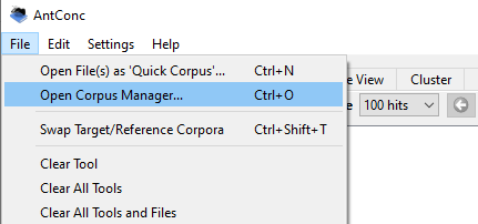 Ouvrez AntConc. Cliquez sur « File », puis sur « Open corpus manager ».