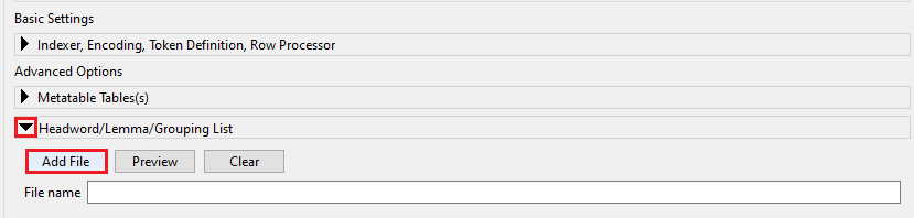 Retournez dans le Corpus Manager de AntConc. Déplacez votre curseur dans le coin inférieur gauche de la fenêtre et déroulez le menu « Headword/Lemma/Grouping ». Cliquez sur « Add file ». Votre explorateur de fichiers s’ouvrira alors. Chargez le fichier « lefff-antconclex-f » dans AntConc.