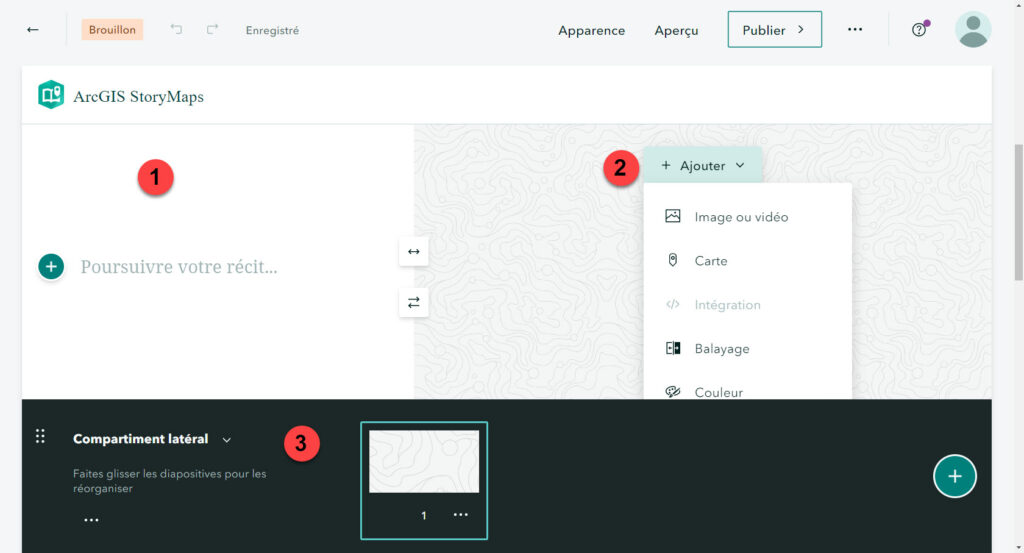 - Une section (1) pour ajouter du texte ou d’autres contenus (images, vidéos, etc.).