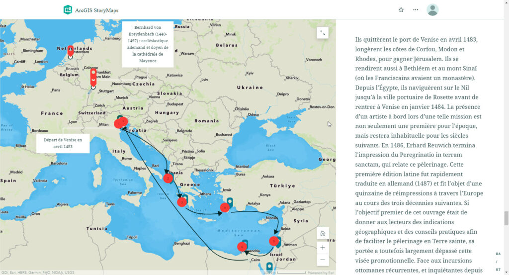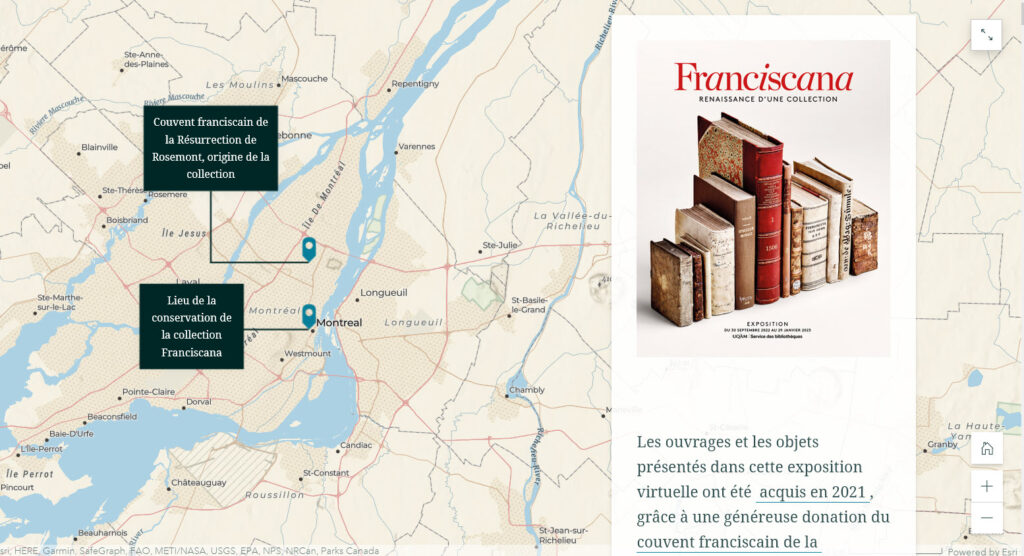 Un exemple de transposition de contenus du site de l’exposition de livres rares Franciscana – renaissance d’une collection avec ArcGIS StoryMaps. Cela permet une présentation géographique des lieux de conservation et d’édition de quelques livres anciens d’une collection léguée par les franciscains à l’UQAM.