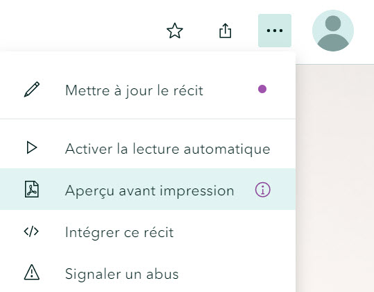 Une fois publié, il est possible de sauvegarder le récit en format PDF ou de l’intégrer (balises iframe) (Figure 9). Il est recommandé de télécharger une copie PDF pour archiver votre travail.