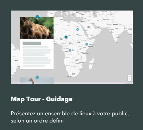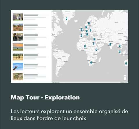 - Le Map Tour – Guidage (Figure 4) permet de présenter sur une seule carte un ensemble en ordre prédéfini.