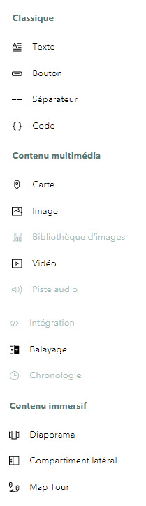 4. De retour dans votre récit, vous pouvez retrouver les cartes ou scènes créées dans le menu + d’ajout de contenu, onglet « cartes »