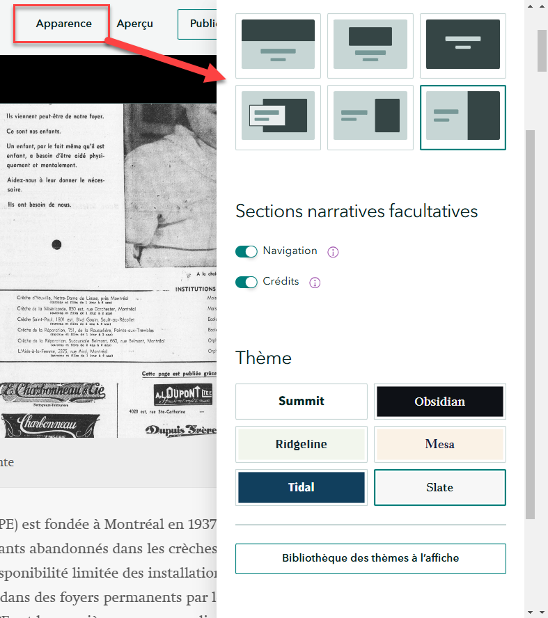 Une fois votre recit créé, dans le menu Apparence, vous pouvez changer la présentation de l’entête et ajouter un menu de navigation. Dans la section Thème se trouve divers choix de couleurs et de police de caractères prédéfinis.