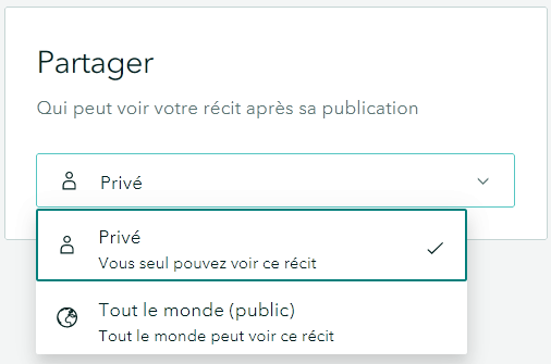 Une fois le travail sur les contenus complété, il faut publier le « récit » en choisissant l’option « privé » ou « public » (Figure 8). Pour le partager, copier ensuite le lien URL du récit qui se trouve dans la barre du navigateur.