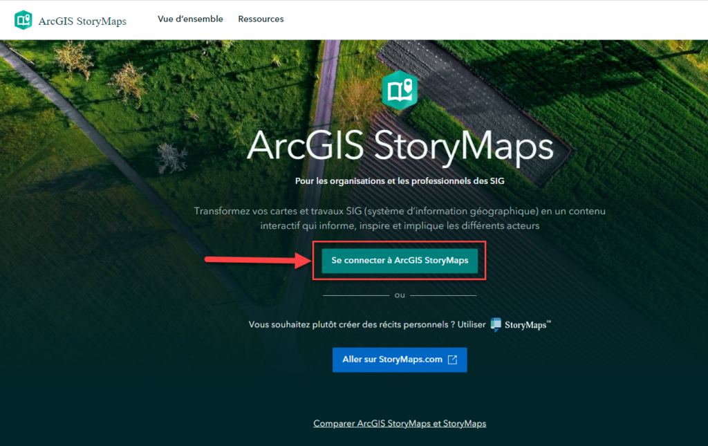 Créer un compte public ArcGIS et sélectionner l’option « Se connecter à ArcGIS StoryMaps » sur la page d’accueil.